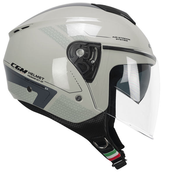 Motoristična jet odprta čelada Italijanskega proizvajalca CGM z vgrajenim premičnim notranjim VPS sončnim vizirjem ter velikim zunanjim zaščitnim vizirjem. Homologacija 22-06!